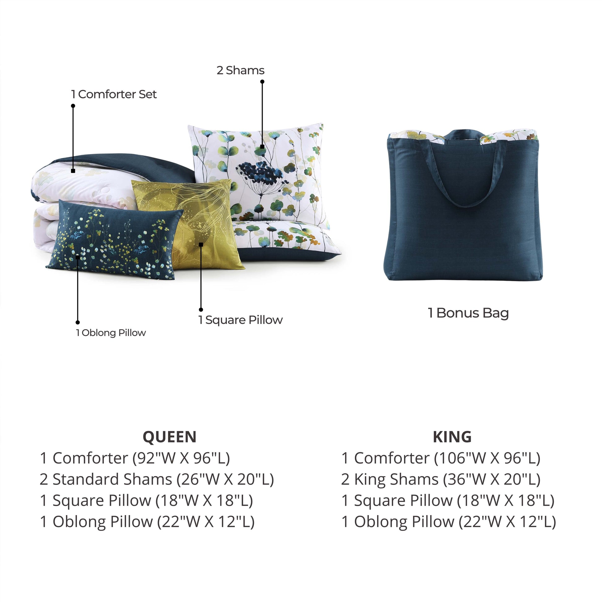 Set Includes: 1 Comforter | 2 Shams | 2 Decorative Pillows | 1 Sustainable Fabric Bonus Bag