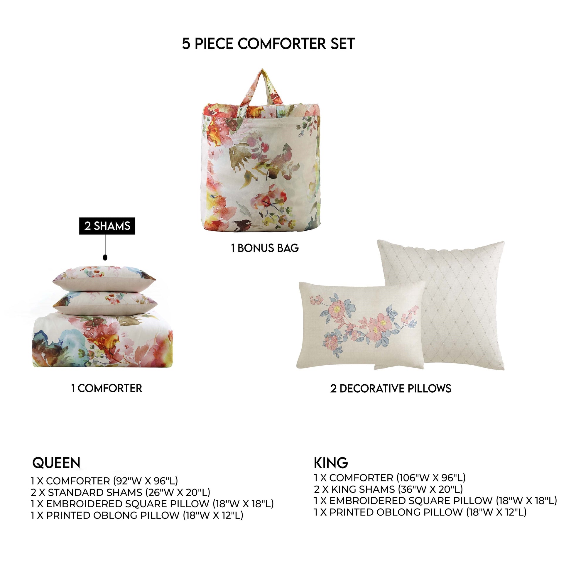 Comforter Set Includes: 1 Comforter | 2 Shams | 2 Decorative Pillows | 1 Sustainable Fabric Bonus Bag