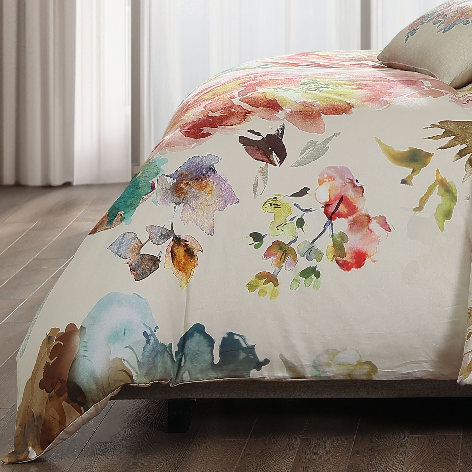 Gorgeous jewel-toned blooms look as if they are hand-painted on a warm ivory base in this Antique Flowers 5 piece reversible comforter set. This stunning oversized print exudes luxury, while the reverse print, with a subtle linen texture, provides a soft contrast on the 200 Thread Count 100% cotton sateen fabric. The cozy 5 piece set also includes 2 shams, an 18x18” embroidered diamond patterned pillow, and a 12x18” printed pillow.