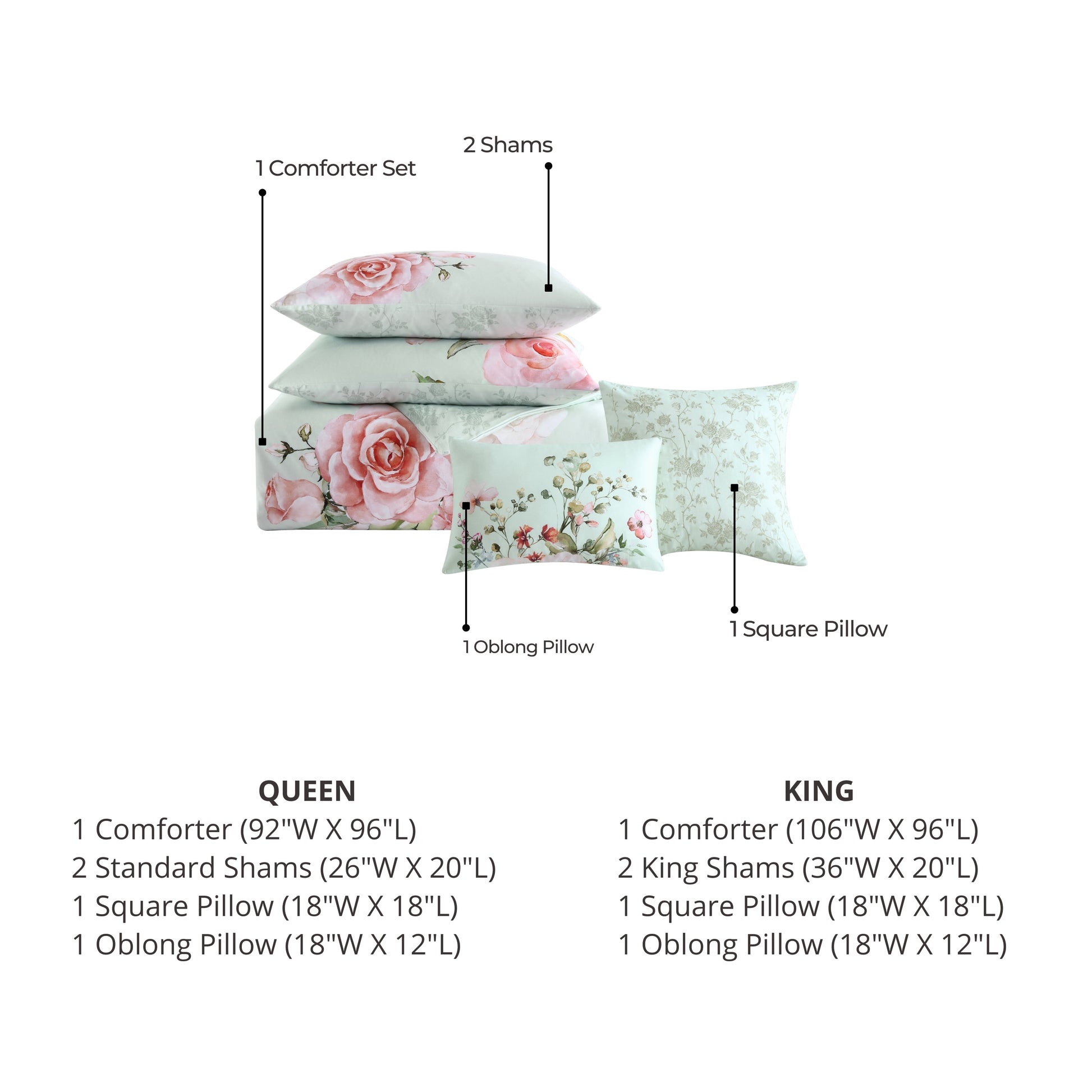 The cool, calm, pale green of the rose on misty green 5 piece reversible comforter set is the perfect backdrop for the exploding rose and hydrangea blooms on this stunning oversized print. The reverse print, with a charming tonal rose pattern, provides a more subtle floral motif on the 200 Thread Count 100% cotton sateen fabric. this cozy and soft 100% cotton sateen comforter set also includes 1 reversible comforter, 2 reversible shams, 1 embroidered square decorative throw pillow 18x18” that mimics the reverse print and 1 printed oblong decorative throw pillow 18x12”.