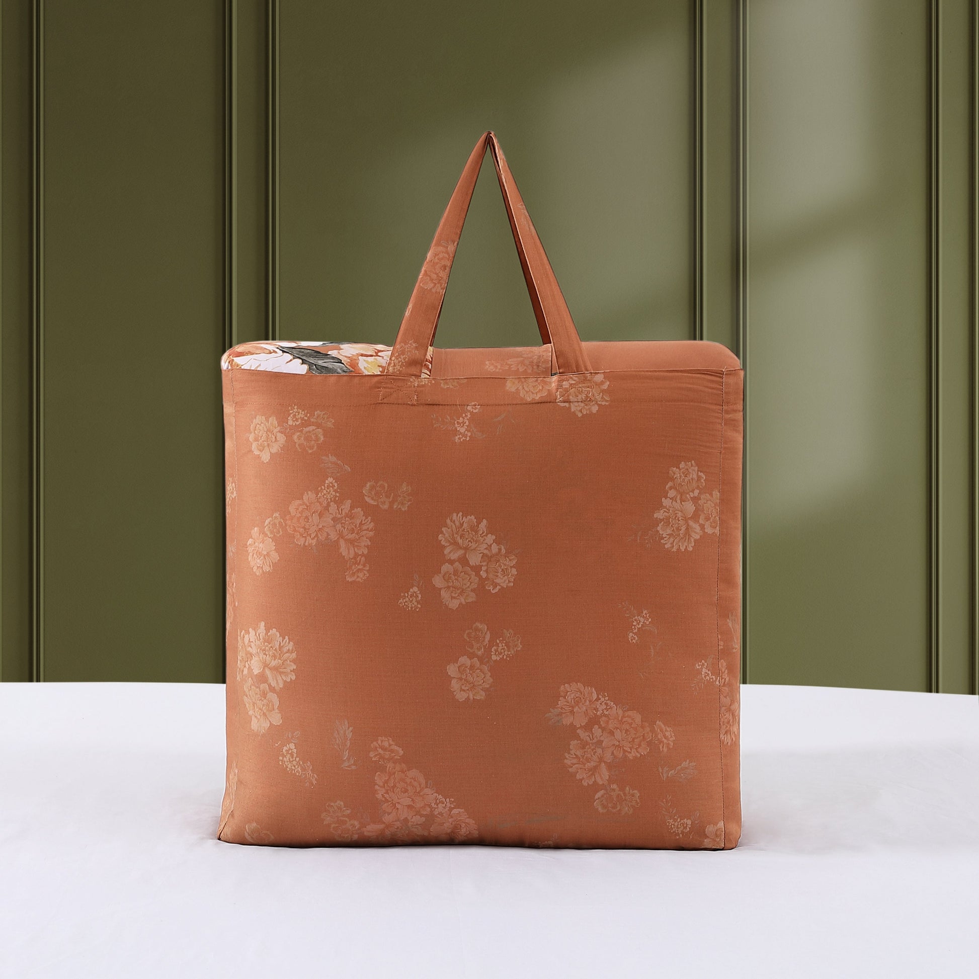 - Comforter Front: Asian inspired floral pattern in terracotta, apricot and warm green tones